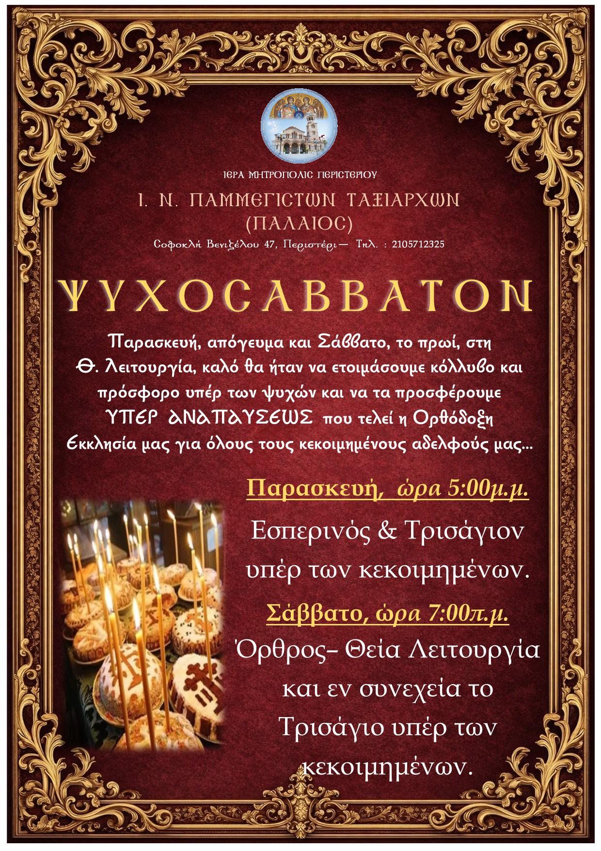 Επί τη αναμνήσει του διά κολλύβων θαύματος του αγίου ενδόξου μεγαλομάρτυρος Θεοδώρου του Τήρωνος σήμερα το απόγευμα 16:30 πριν από την ακολουθία των Α΄Χαιρετισμών θα τελεσθεί ΤΡΙΣΑΓΙΟ υπέρ αναπαύσεως των κοιμηθέντων αδελφών μας. Αύριο το πρωί ο Όρθρος και η Θεία Λειοτυργία , μετά δε το πέρας αυτής θα τελεστεί ΤΡΙΣΑΓΙΟ υπέρ αναπαύσεως των...