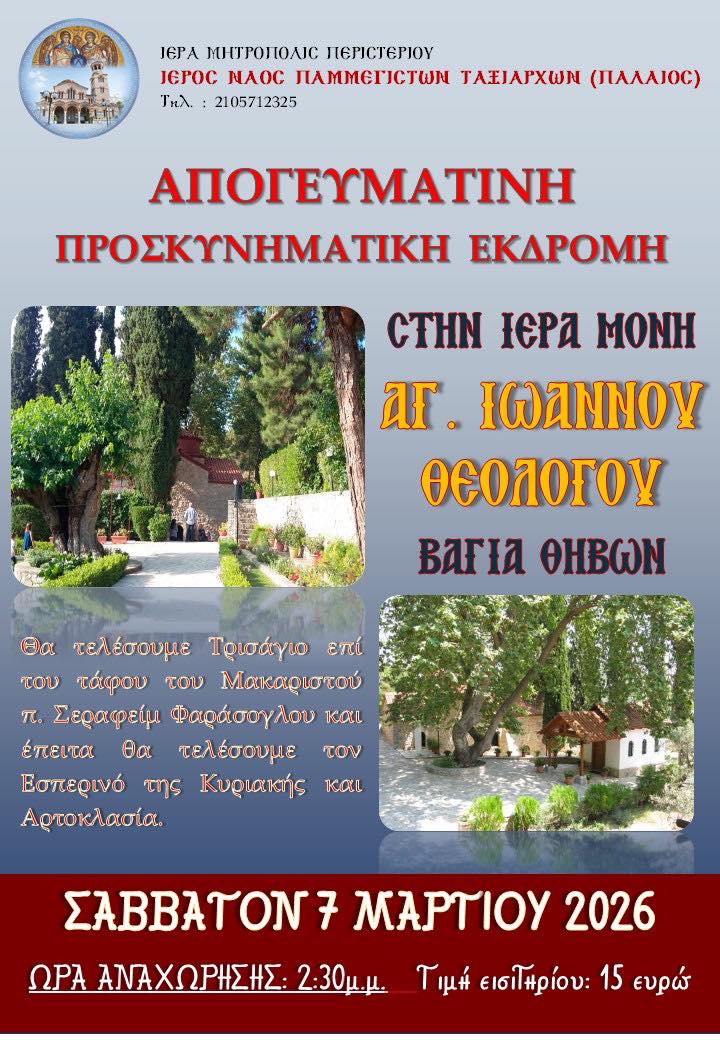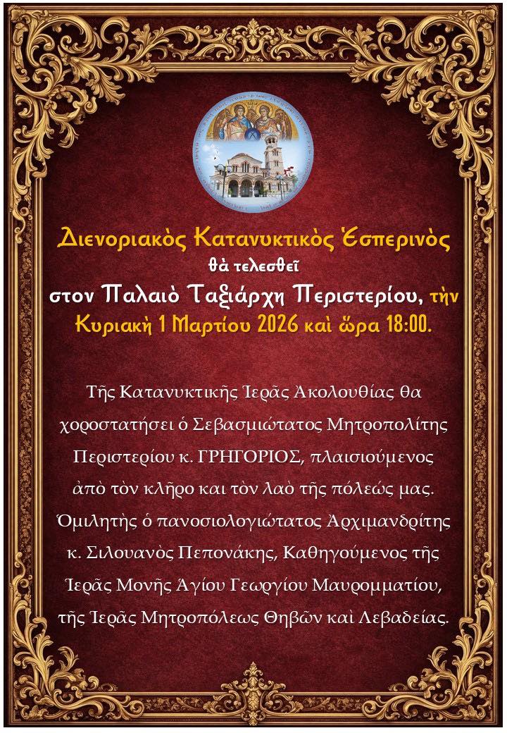 Την ερχόμενη Κυριακή της Απόκρεω 15 Φεβρουαρίου θα έχουμε την μεγάλη τιμή και χαρά να χοροστατήσει και να ιερουργήσει στον ναό μας ο Σεπτός Ποιμενάρχης μας Σεβασμιώτατος Μητροπολίτης Περιστερίου κ. Γρηγόριος. Παρακαλούνται οι ευλαβείς χριστιανοί όπως προσέλθουν και συμμετάσχουν εις την Αρχιερατική Θεία Λειτουργία μετά φόβου Θεού πίστεως και αγάπης....
