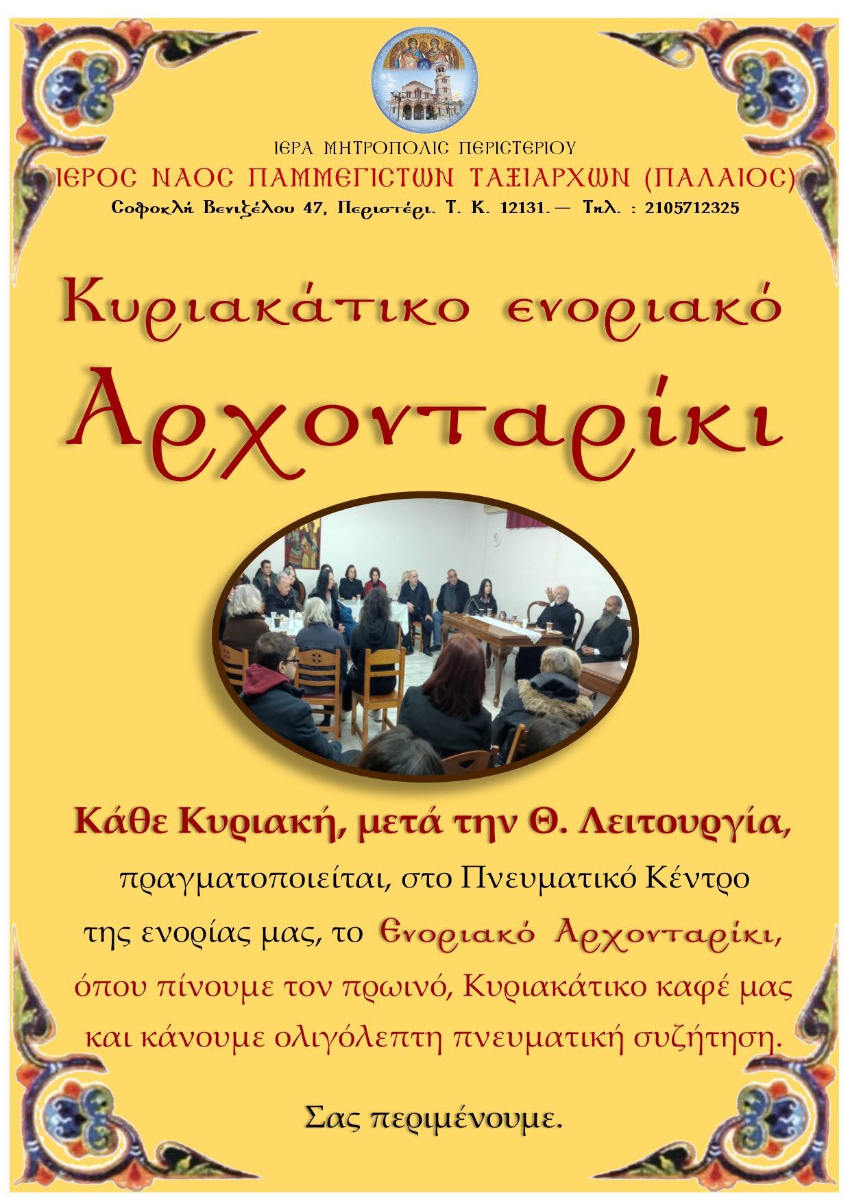 Κυριακάτικο, ενοριακό Αρχονταρίκι. Σας περιμένουμε, από την ερχόμενη Κυριακή και κάθε Κυριακή, μετά τη Θεία Λειτουργία. Στο φιλόξενο χώρο του Πνευματικού Κέντρου της ενορίας μας προσφέρεται πρωινός καφές και εδέσματα και ακολουθεί ολιγόλεπτη πνευματική συζήτηση.