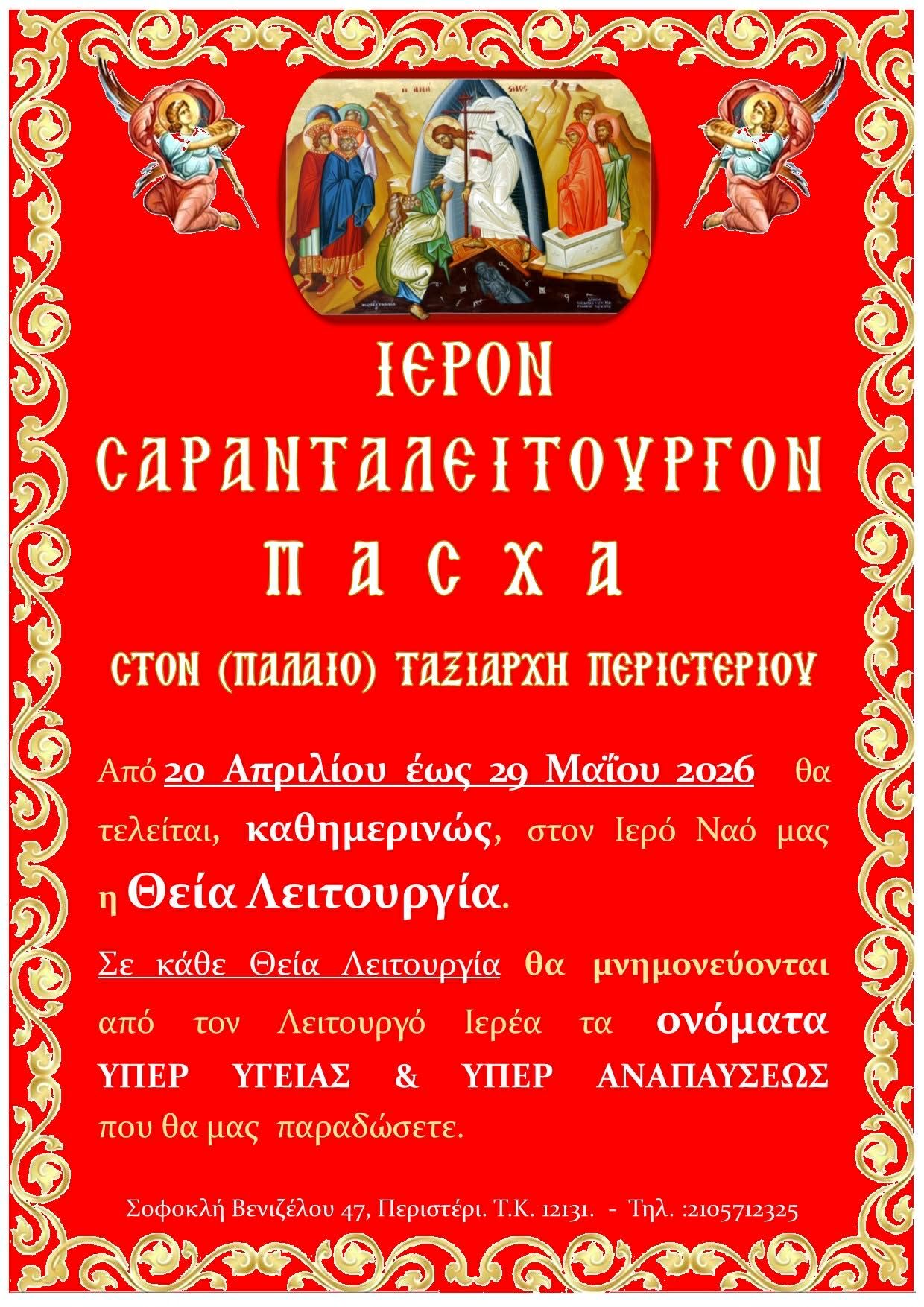Ιερόν Σαρανταλείτουργον Πάσχα 2026